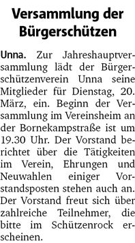 Am Freitag, den 22.03.19 fand in der Gaststätte Klüting's die Jahreshauptversammlung des Bürger-Schützen-Vereins Unna statt.